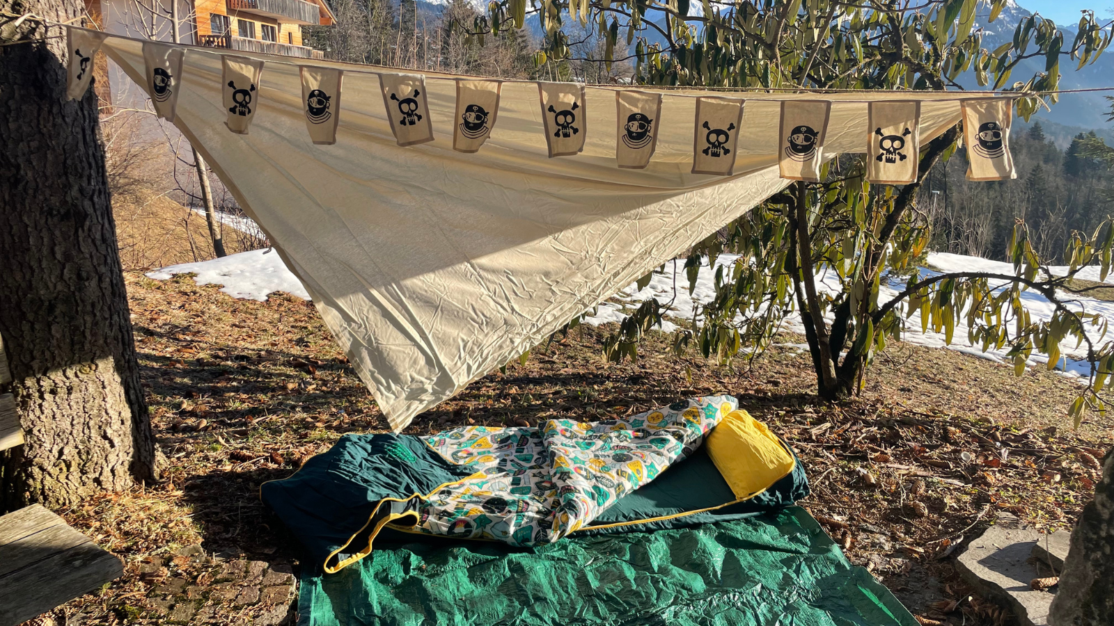 Get your child to collect & carry their own kit - handing over responsibility but critically ownership of what they need to build their den. We'd (predictably!) suggest a den kit, complete with tarp, ground sheet, mallet, pegs and rope.